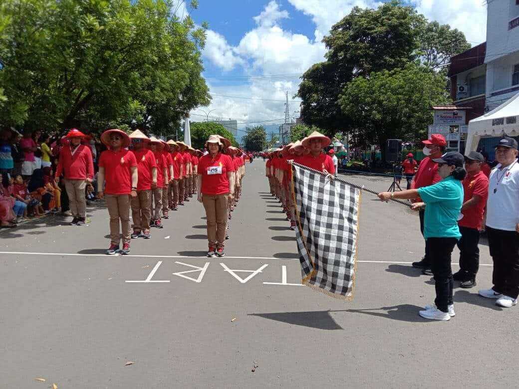 Peserta Gerak Jalan DKPP dengan nomor dada 145 dilepas langsung oleh Ketua Umum Panitia, Kepala Dinas Pendidikan & Kebudayaan yang juga adalah Plt Kadis Capil, Eugenie Mantiri, S.Pd, M.AP, Menurut Eugenie peserta Gerek jalan kategori umum ini berjumlah 309 Peserta