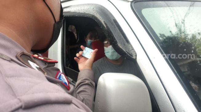 Puluhan mobil diberhentikan paksa oleh petugas gabungan di pos penyekatan exit Tol Bitung, Kabupaten Tangerang. Mereka diperiksa agar tak melakukan perjalanan mudik.